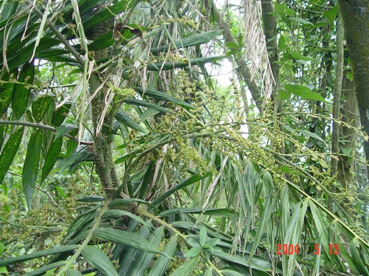 The Yellow Rotang Palm (Calamus jenkinsianus) is a common plant in Taiwan. Also known as rattan or cane palm, it grows widely all over Taiwan, from 300 metres altitude to 2,000 metres, often in a thicket alongside bamboo and other varieties of plants. For indigenous people in the 19th and early 20th century, rattan was a very important plant. Young specimens were used in cooking and medicine, while the mature plant, up to several meters tall, had great economic value for the making of rattan work. Despite being very thorny on its steins and leaves, the skin of the plant could be made into rope. Rattan was also used in hunting, to create animal traps.