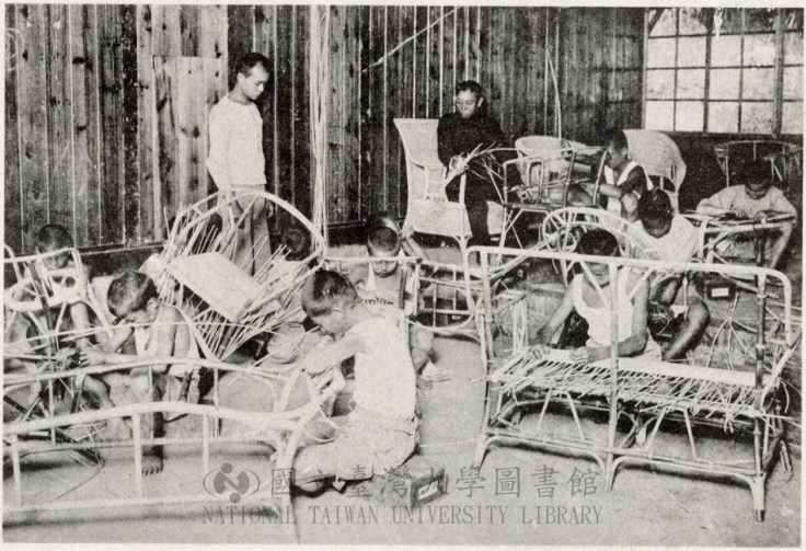 In 1909, Chengde Juvenile Detention Centre was established on the hillside outside of Taipei, at first receiving problem boys under the age of 14, and later extended to under 18. The centre advocated re-education based on Buddhist teaching, alongside training in craft skills. Image 3 was taken in 1934, and shows young inmates making rattan furniture, while the teacher sits on a rattan armchair.